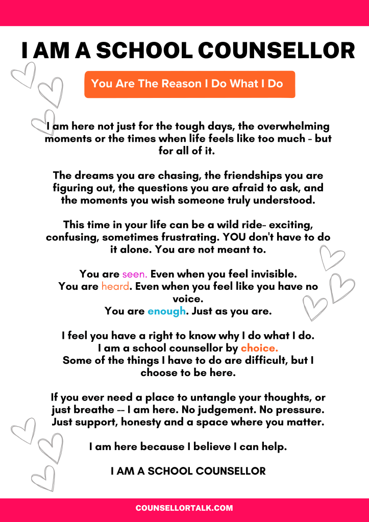 The students are why school counsellors do what they do. It has been my privilege over the years to do what I do. So if any of the below resonates with you, please feel free to use it.